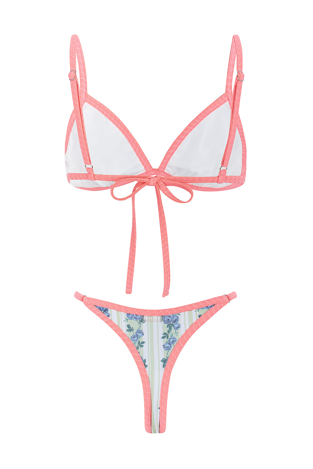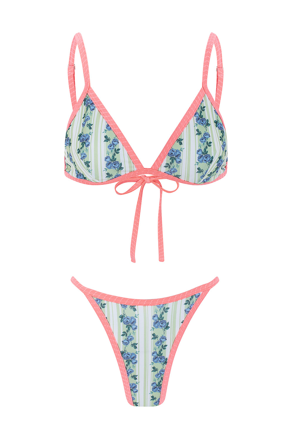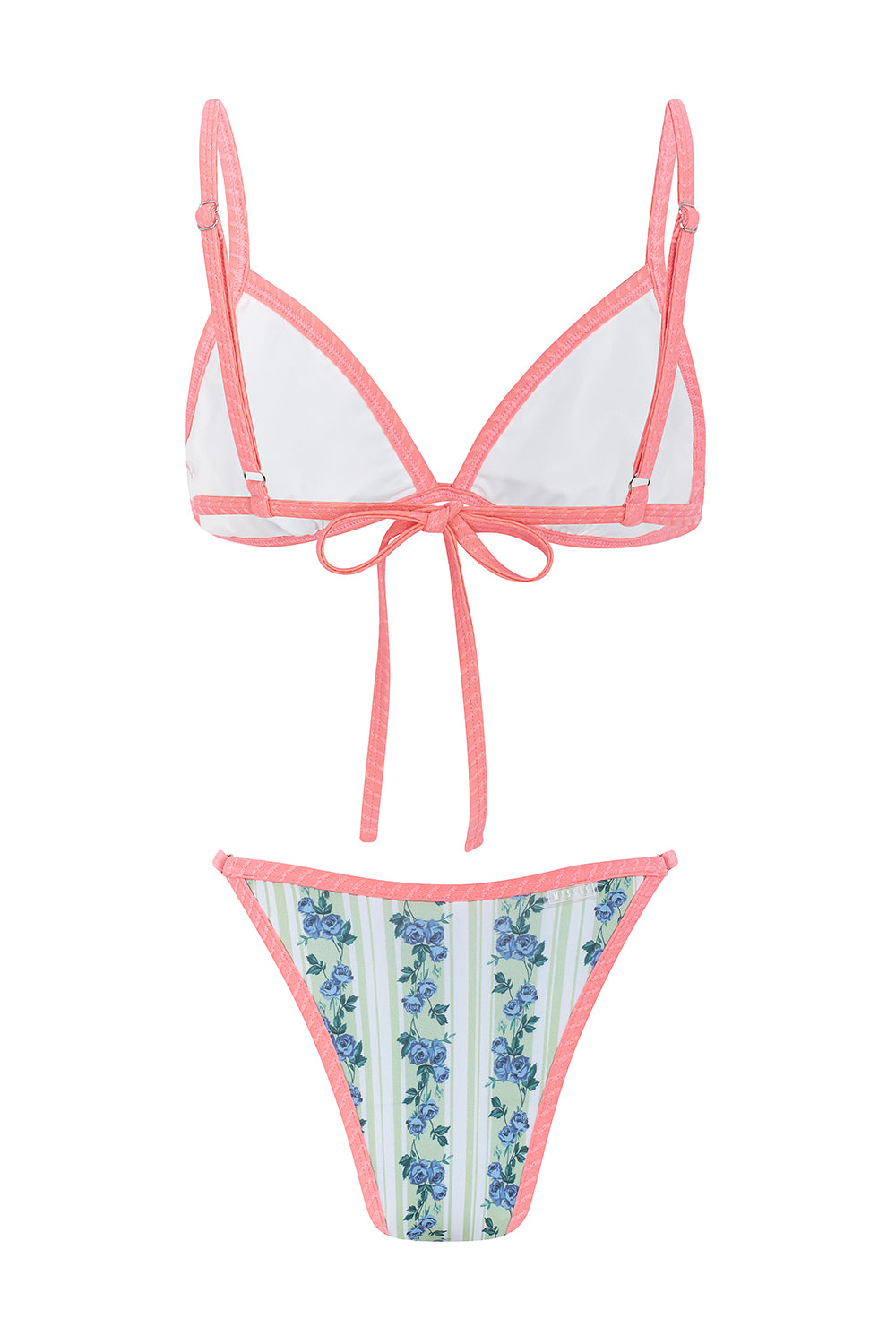 Biquíni azul e verde floral estampado com contraste a rosa texturado. Aproveitamento de matérias primas de coleções passadas, de forma a promover a sustentabilidade.
